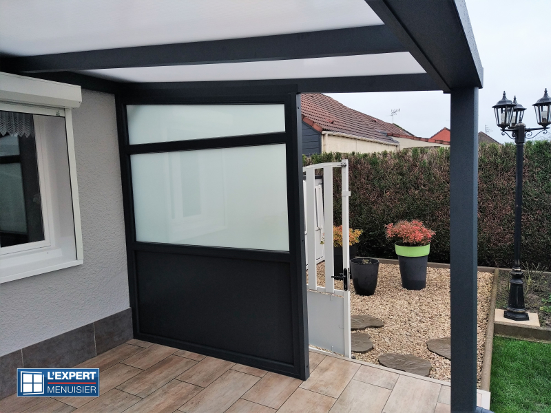 Fermetures latérales en PVC gris anthracite avec soubassements et vitrage feuilleté mat